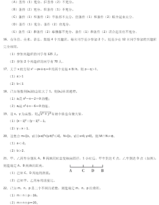 二、条件充分性判断:第16——25小题,每小题3分,共30分,要求判断每题给出的条件(1)和条件(2)能否充分支持题干下所以陈述的结论。A、B、C、D、E五个选项为判断结果,请选择一项符合试题要求的判断。
